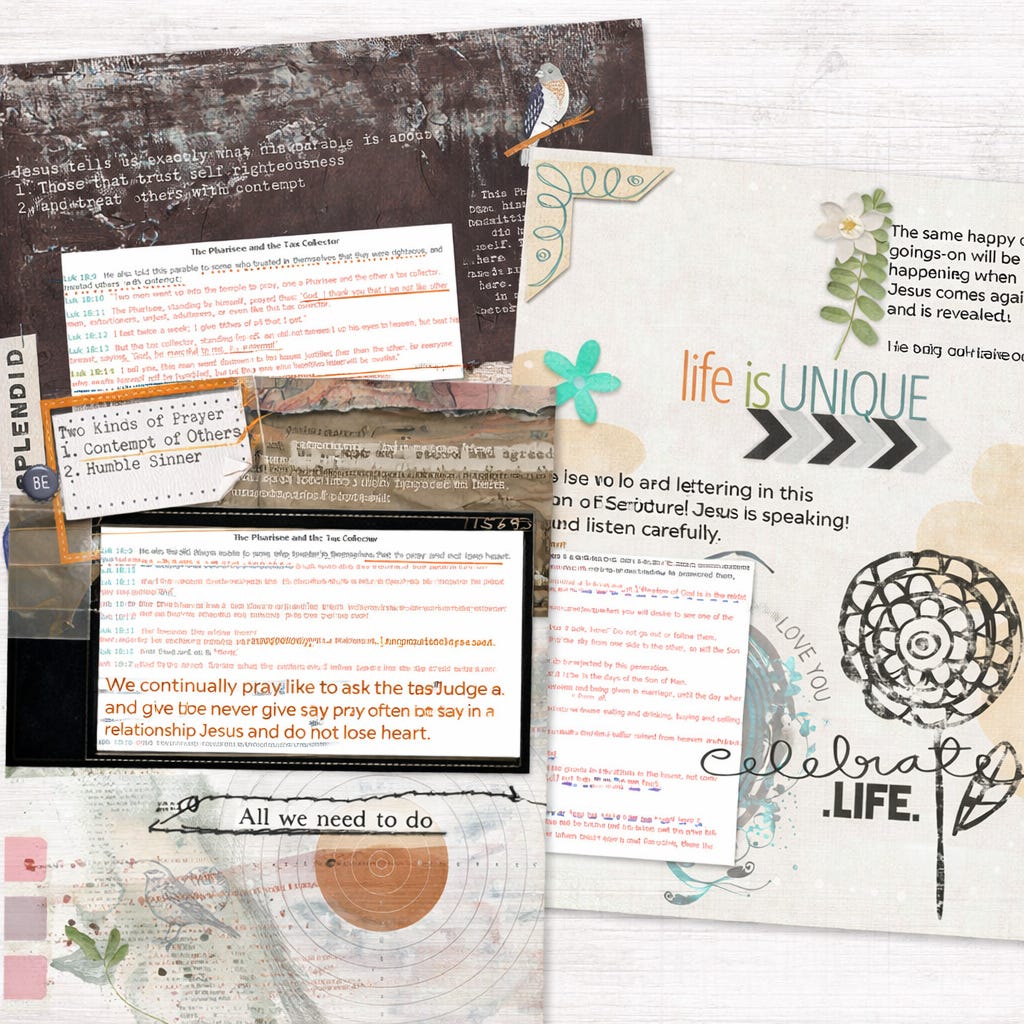 When I went to look on my website to see if I had done this (inadvertent) verse 18:13, I found not only had I not done a digital Bible journaling page for it, but I made another faux pas in that I inadvertantly put three stories on one website page! Argh! STOOPID again!